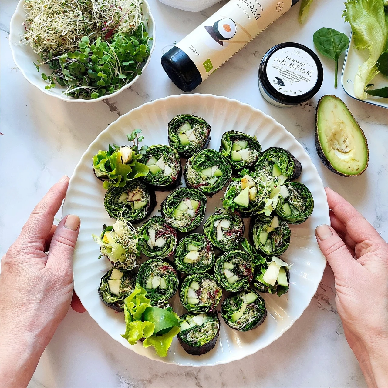 Alusta lehtrohelisest (see kaitseb nori niiskemate komponentide eest), seejärel lisa karulauk või sibul, kurk, avokaado ja pirn. Jaota kõige peale idandid ja tõusmed.