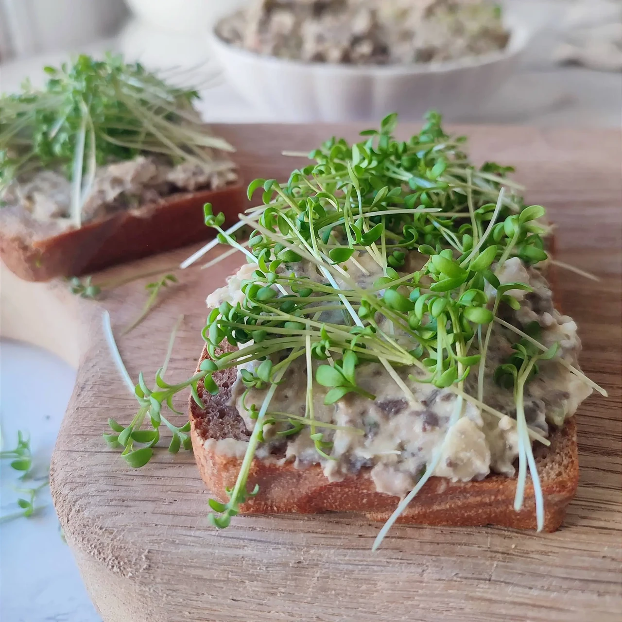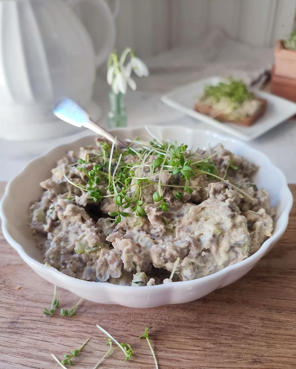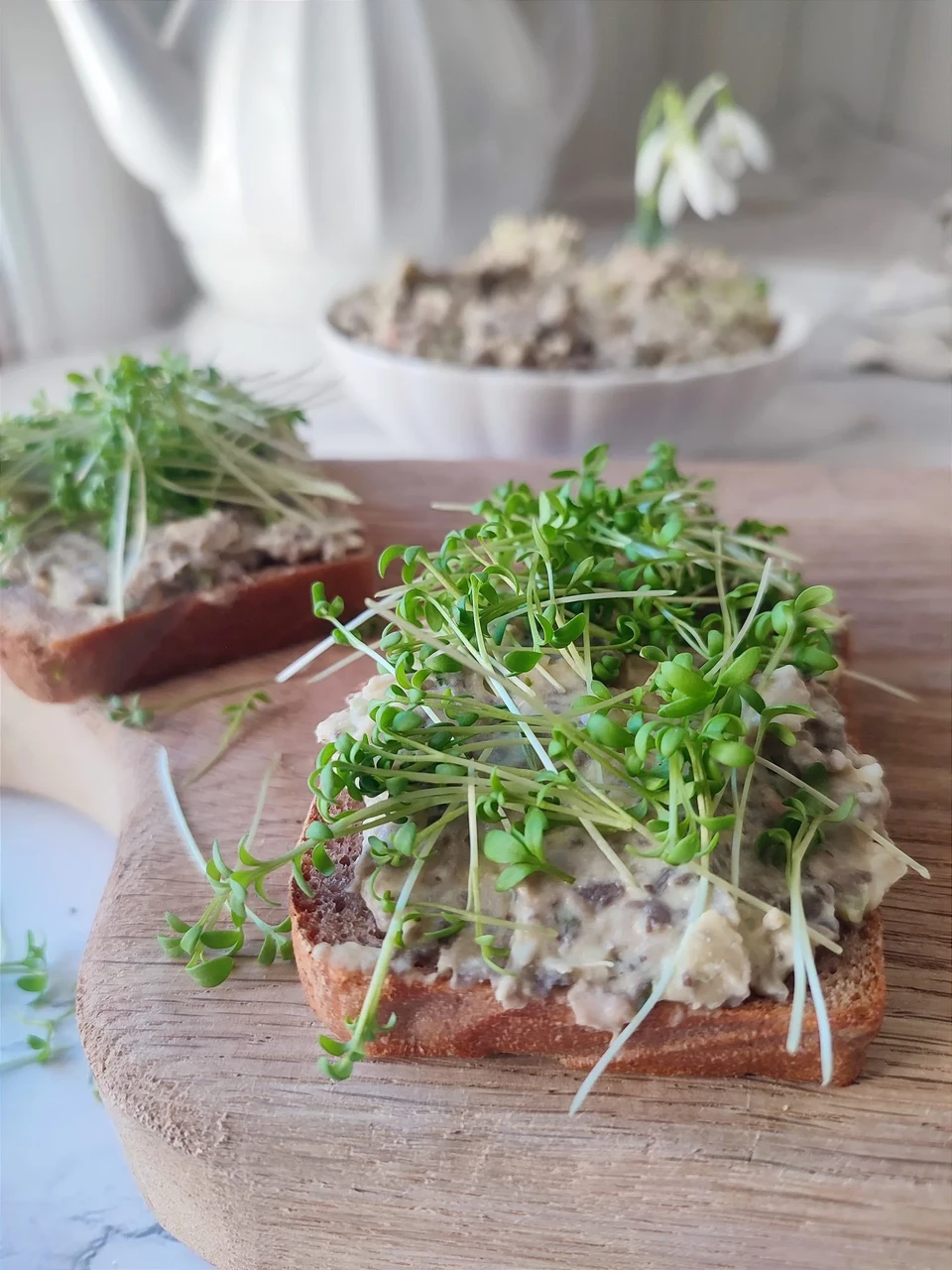 Kreemine ja mõnusalt tuttava tekstuuriga taimne “munavõi”, kus seened ja valged oad loovad põhja ja must sool kala namak annab kergelt munase nüansi. Kressi tõusmed toovad siia retsepti värske ja kergelt pikantse noodi, mis sobivad suurepäraselt just sellisele "munavõileivale" – täpselt nagu klassikalises Inglise kella viie tee kressi-munavõileivas.