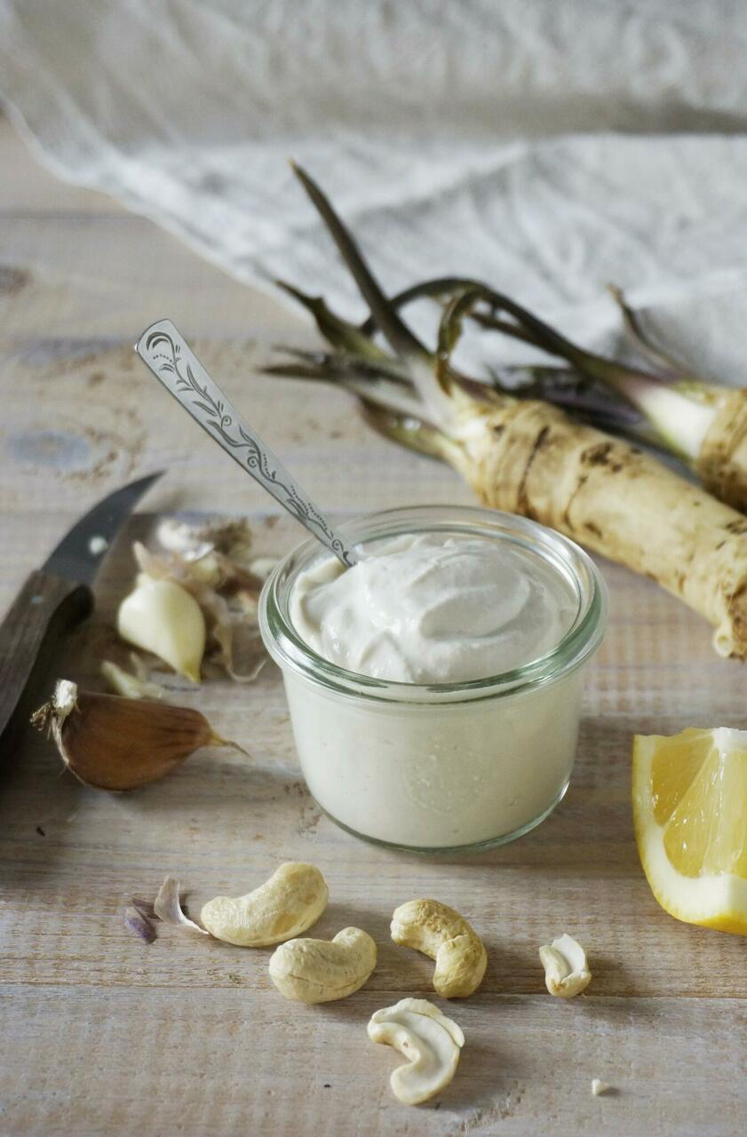 Leota eelnevalt india pähkleid 2-6 tundi. Kalla leotusvesi ära ja loputa pähklid. Leotatud pähklid kalla retseptis toodud veekogusega blendrikannu ja blenderda kreemjaks. Kraabi spaatliga valminud koorekaste kaussi. Maitsesta mädarõika, sidrunimahla ja sinepipulbriga. Kui soovid, lisa ka terake soola.