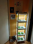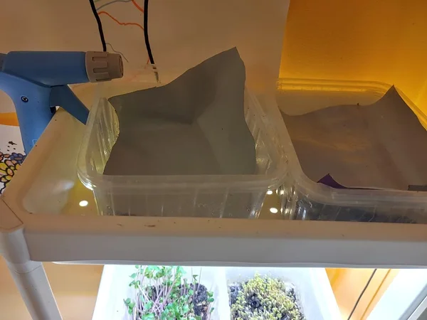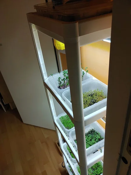Seemned ja lambi alla mahtuvate karpide arv on enamvähem niimoodi paika saanud, et iga päev saab uue karbitäie süüa. Igapäevast hoolt vajavad vaid kaetud seemned idanemisefaasis, mida pritsin pealt. Suuremaid võrseid kastan alt mõne päeva tagant. Lamp on seadistatud ise süttima ja kustuma 12-tunnise intervalliga, st sellega vaeva ei ole vaja näha.