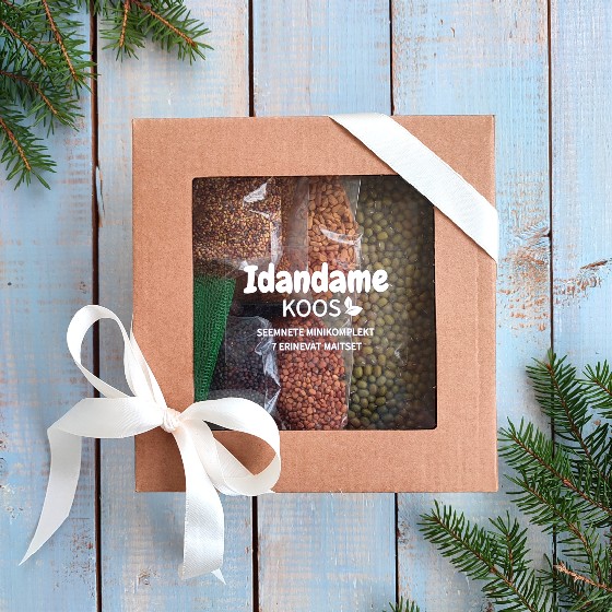 Komplektis 7 erinevat seemet: munguba (250g), rohelised läätsed (250g), sinilutsern (50g), taliredis ehk daikon (20g), punane ristik (50g), brokoli (20g), põld-lambalääts (50g).