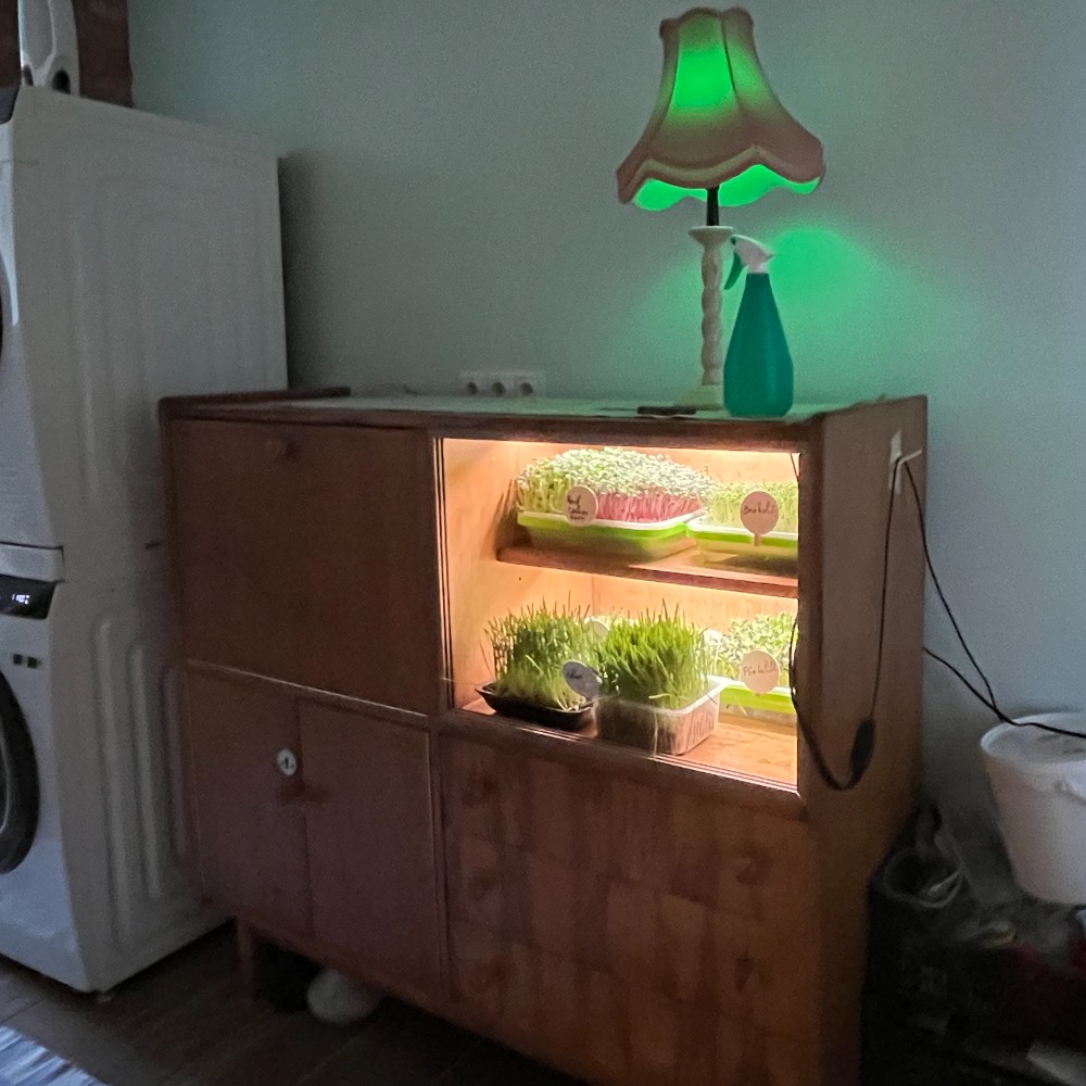 Töötoast sain palju nippe ja osta kaasa erinevaid seemneid, kookosmatte. Sealt edasi tekitasingi omale koju nostalgilisse kappi roheakna. Ostsin vastavad lambid ja kasvatan nüüd igapäevaselt/iganädalaselt omale vajalikku, mis kõnetab.