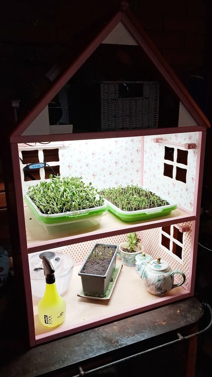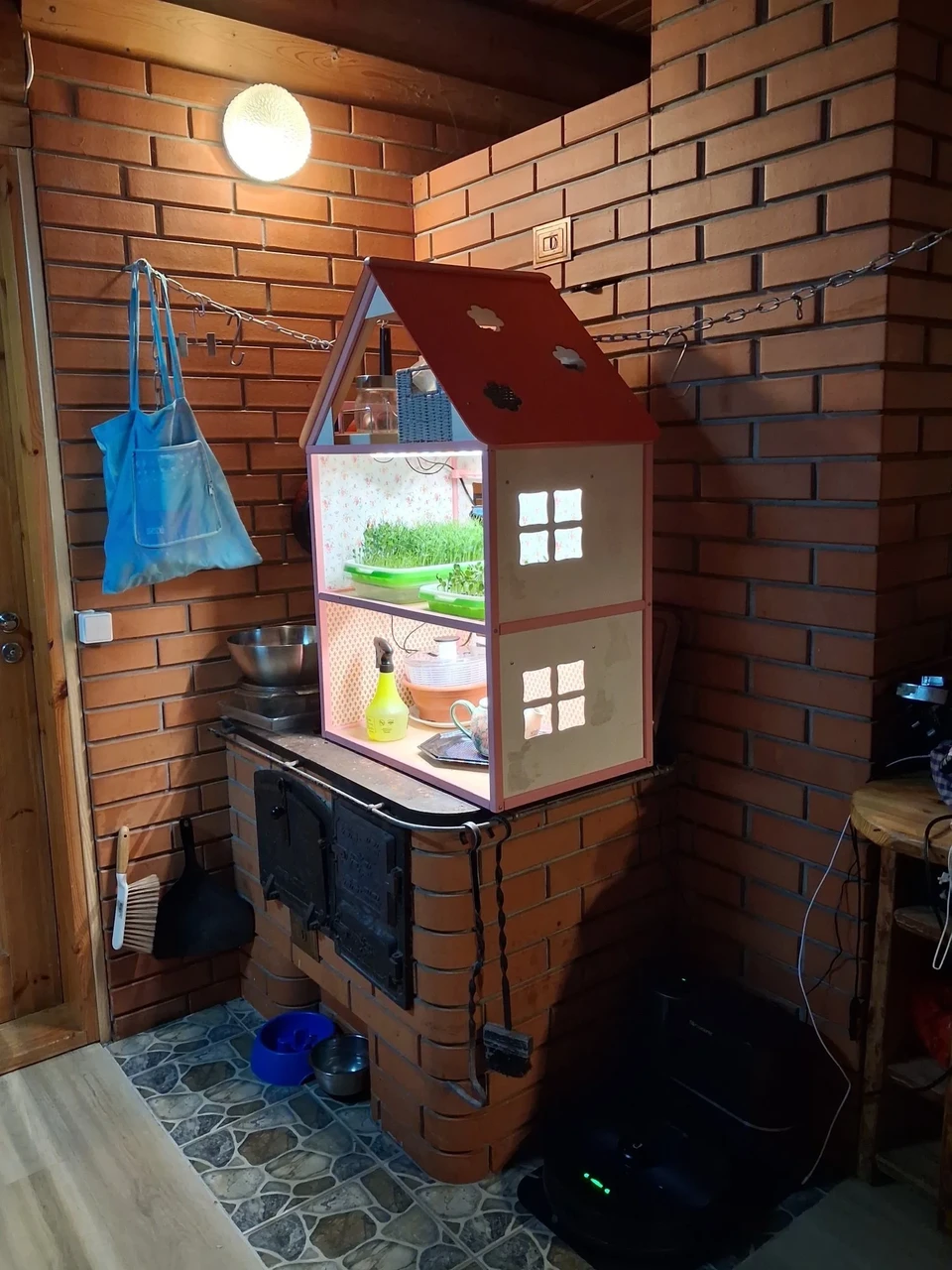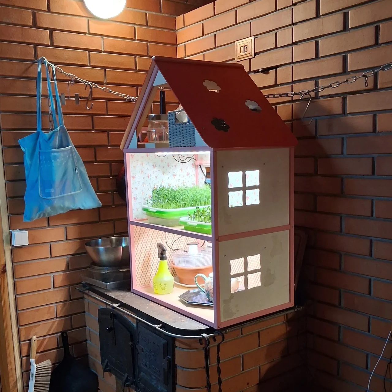 Talvel aga on meil liiga pime ja mõte teha valgustusega riiul idanes juba mitu aastat peas, kui korraga selgus, et meie noorim laps, kes kolme venna kõrval on tüdruk - on saanud nii suureks, et oma nukumajaga ei mängi. Kuna neid "tüdrukute asju" sain nii kaua oodata, siis majast loobumine tundus raske. Küll aga sai sellest lihtsate vahenditega vahva kasvumaja meisterdatud - Väike Värvu e-poest saime lambid kiirelt kätte ja katusealune jäi veel sobivalt tarvikute hoidmiseks.