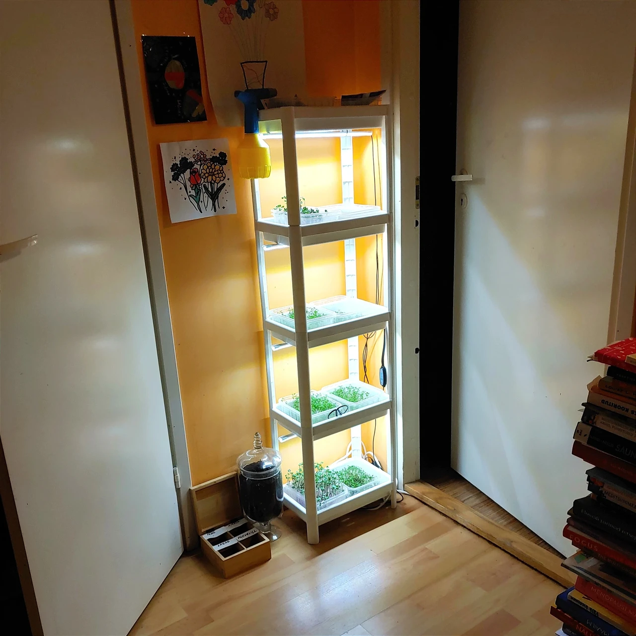 "Minu tõusmete kasvukoht on väikeses korteris, kus see on paigutatud magamistoa ja vannitoa vahele jääva väikese seinakese äärde. Riiuliks sai juba varem kodus olnud IKEA kitsas plastikriiul. Kuna tellitud sai neljane valgusti, siis võtsin teiselt samasuguselt riiulikomplektilt ühe riiuliosa juurde, et ka ülemisel lambil oleks kinnituskoht. Päris üles sai sedasi riiul külvialuste idanemise jaoks, kus hoian neid kaetult ilma lambita.