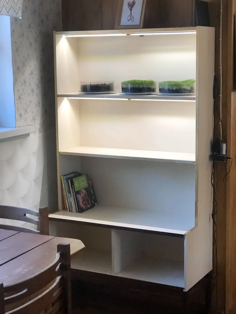 Kasutasin ära vana riiuli, mille abikaasa ära värvis ning kahele riiulile lambid kinnitas. Lambid on pärit Väike Värvust. Riiulikene rõõmustab mind väga ja just selle lihtsa, kuid imelise tunde pärast, et kõik on võimalik, kui vaid tahta. Asjavalminuna on selle all hetkel esimesed tõusmekarbikesed.